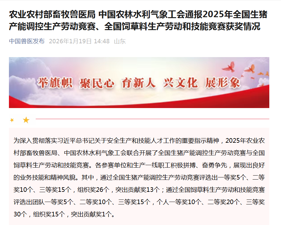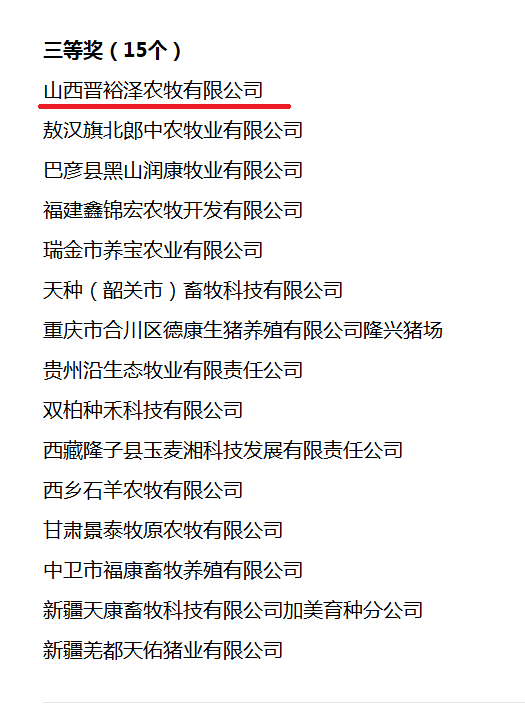 2025年全国生猪产能调控生产劳动竞赛是由农业农村部畜牧兽医局与中国农林水利气象工会联合主办,旨在通过技术比拼与管理创新,激发企业内生动力,保障生猪产品稳定供给。竞赛最终评选出一等奖5个、二等奖10个、三等奖15个、组织奖26个及突出贡献奖13个。山西晋裕泽农牧有限公司凭借在产能调控、安全生产、技术创新等方面的突出表现,成为山西省唯一获奖企业,为区域生猪产业高质量发展树立了典范。